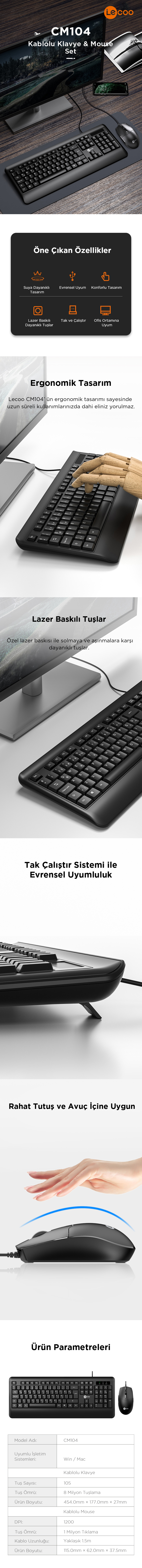 Lecoo CM104, sade ve şık tasarımıyla dikkat çeker. Oyuklu tuş takımı, parmaklarınızı sararak daha kolay ve profesyonel bir kullanım sağlar. Uzun saatler boyunca rahatlıkla kullanılabilir, evde veya iş yerinde güvenilir bir iş ortağıdır.