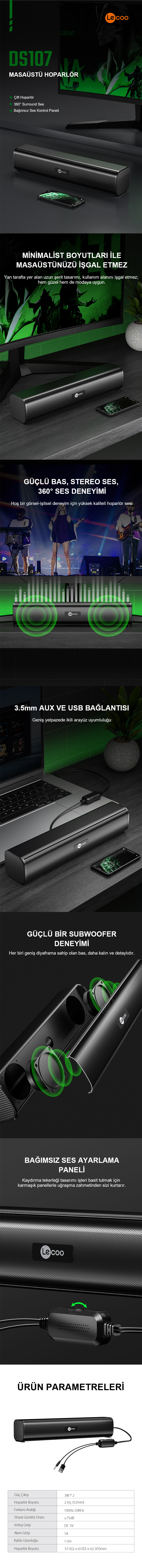 DS107, Lecoo’nun yüksek kaliteli ses deneyimini taşınabilir bir formda sunduğu kablolu soundbarıdır. İşte bu şık ve güçlü soundbarın öne çıkan özellikleri: