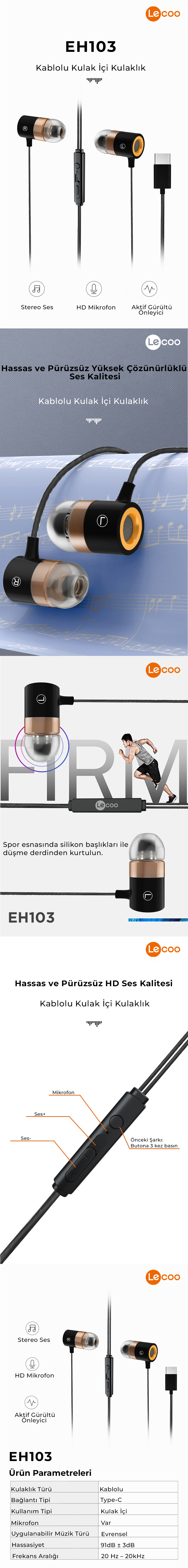 Lecoo EH103 Kablolu Type-C Kulak İçi Mikrofonlu Kulaklık Siyah