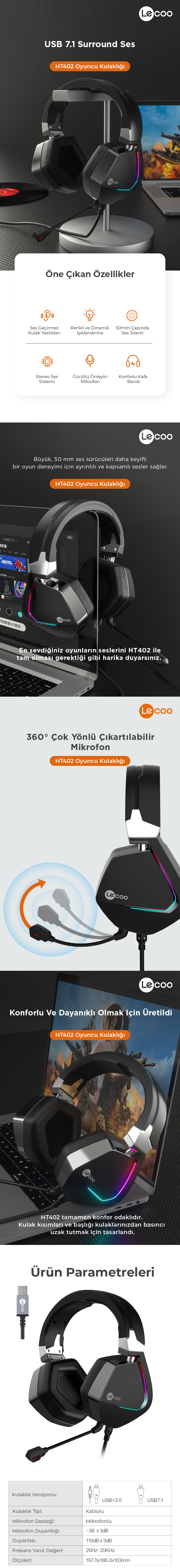 Lecoo HT402 USB Kablolu Oyuncu Kulaklığı USB 7.1 bağlantısı sayesinde hızlı ve sağlam bir bağlantı imkanı sunar. Tak-çalıştır özelliğiyle kolayca kullanılabilir.