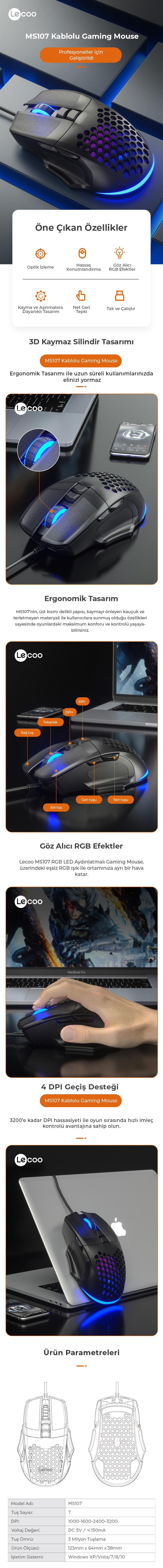 Lecoo MS107 Kablolu RGB LED Aydınlatmalı 3200DPI 7 Tuşlu Gaming Mouse Siyah