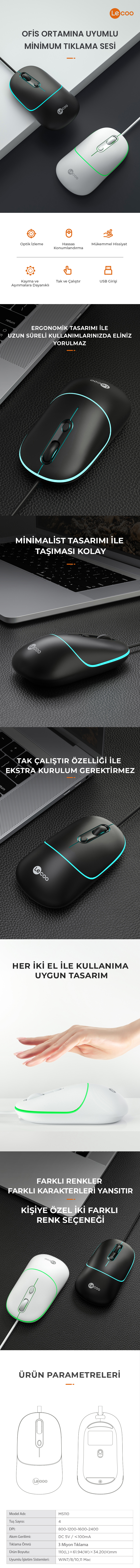 800-1200-1600-2400 DPI ile hızlı tepki veren, kusursuz bir imleç kontrolü ve hassas izleme. Lecoo MS110 ile Mouse hareketleriniz en iyi hale gelecek!